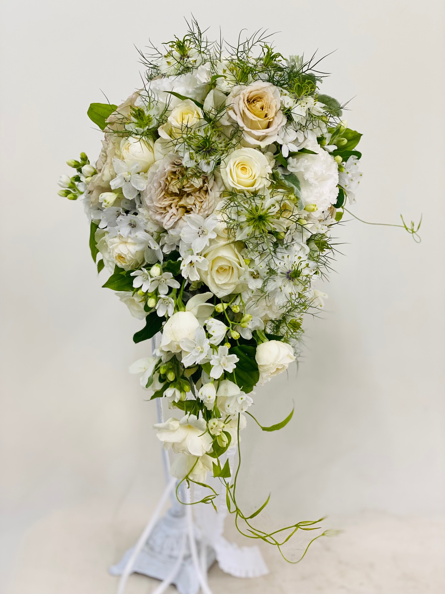 白のキャスケードブーケは、ウエディングのまさに王道スタイル。