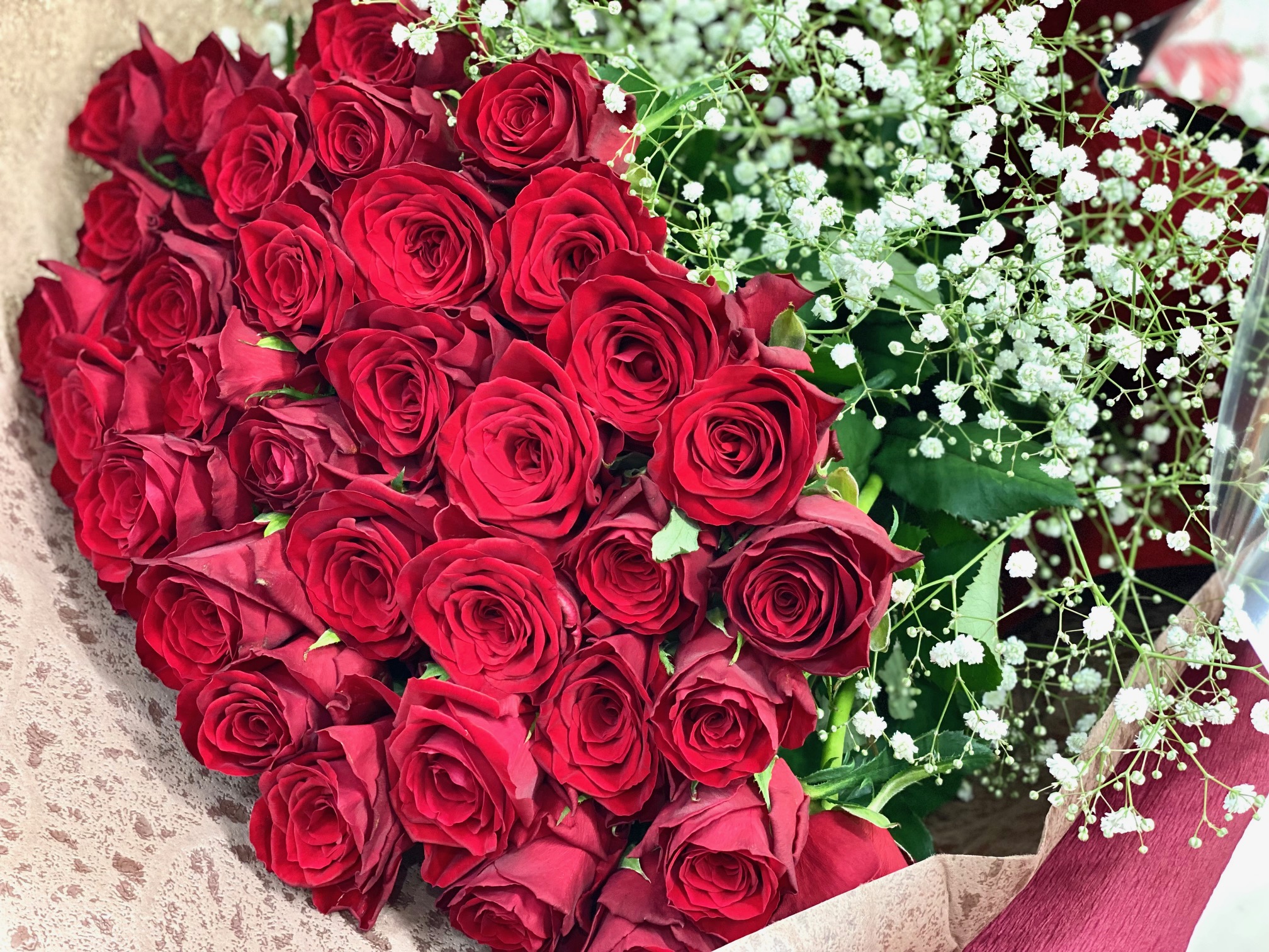 お誕生祝いに赤バラ34本の花束をご用意しました。