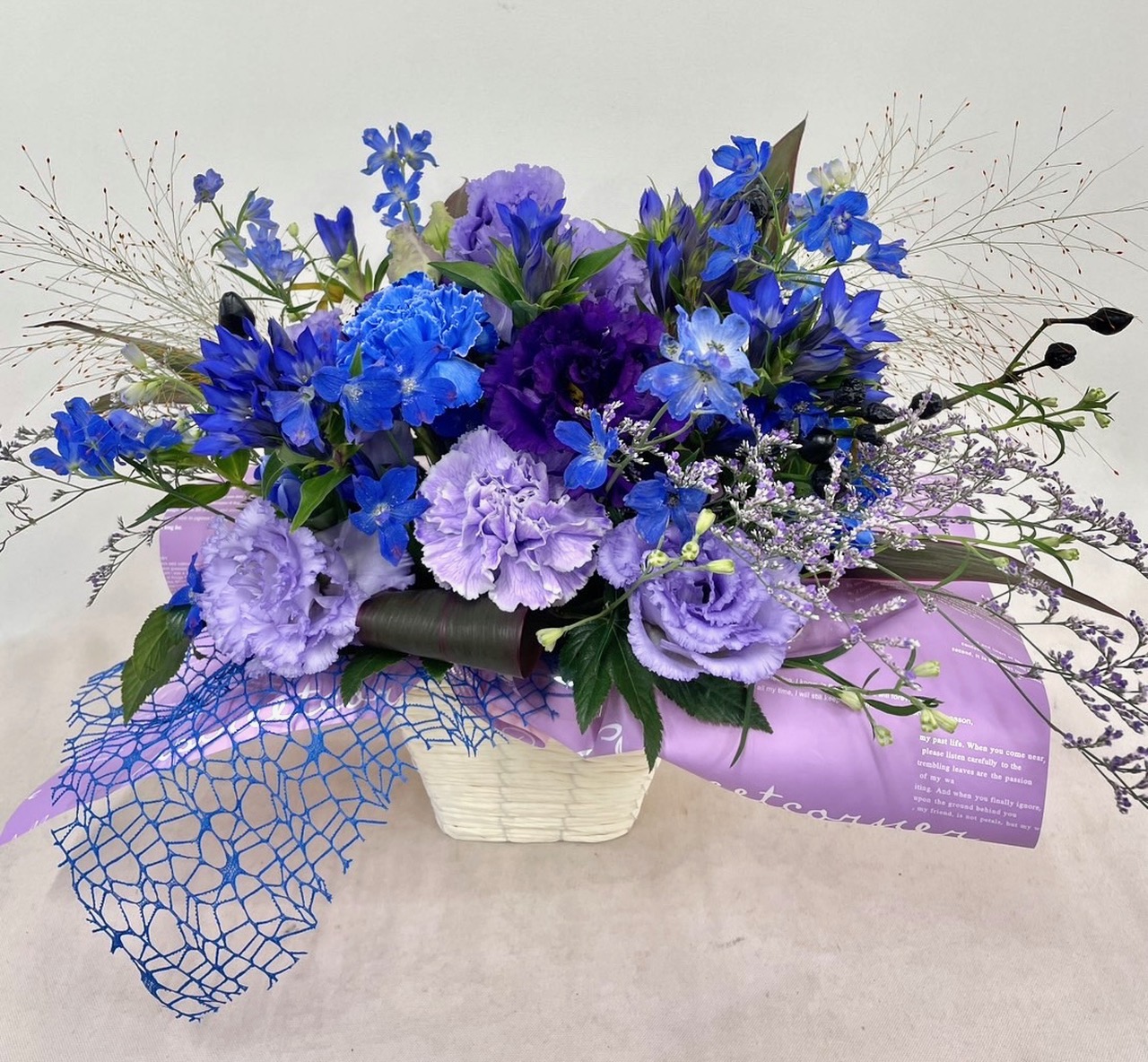 お祝いにブルー/パープル系のアレンジをご用意しました。