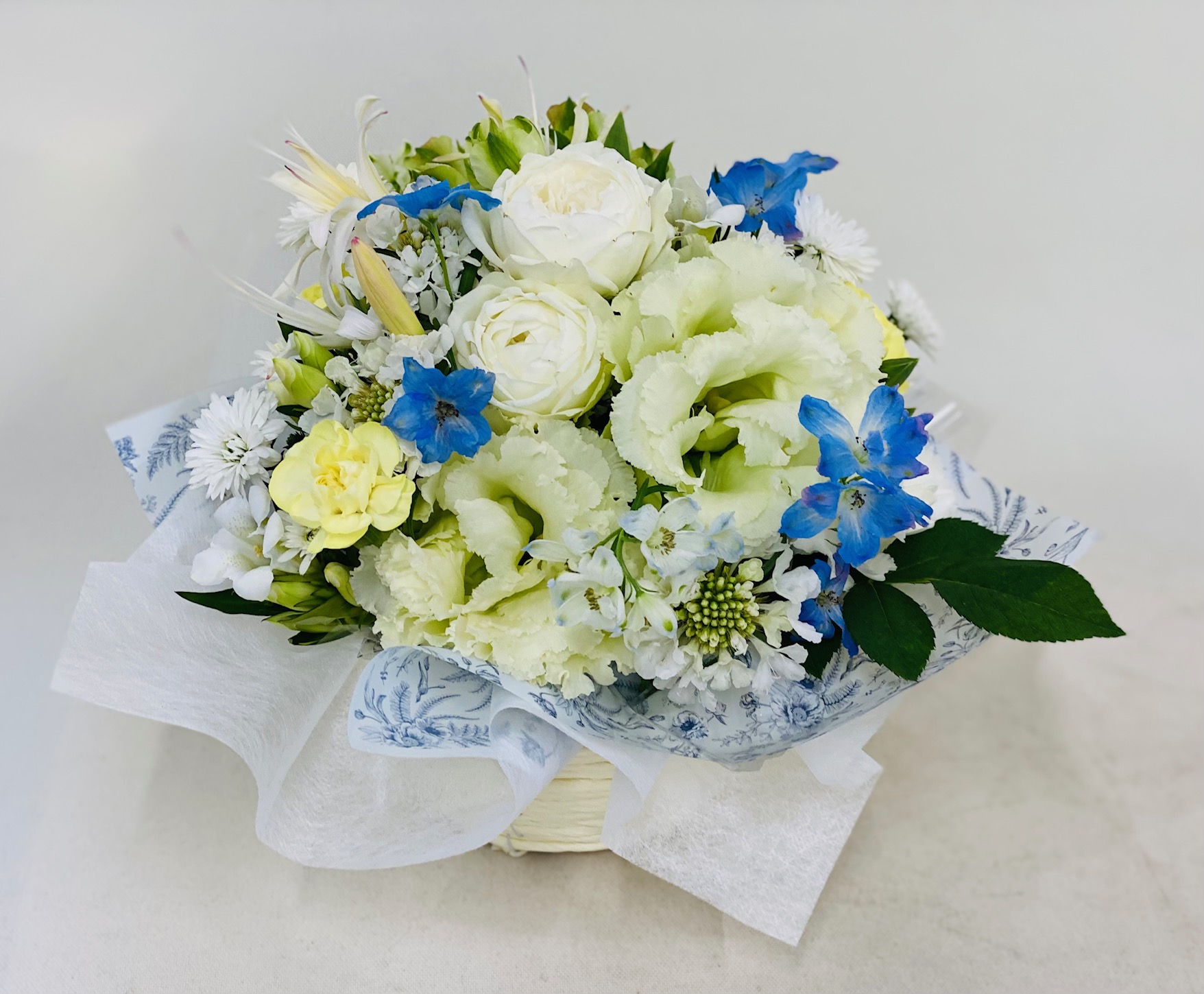 白とブルーでまとめたアレンジ。