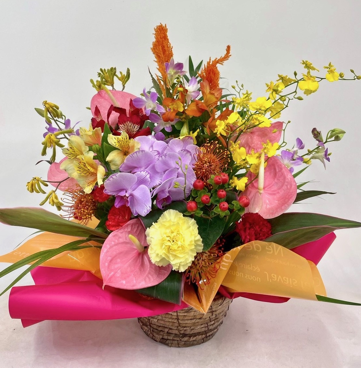 胡蝶蘭やオンシジュームなどの蘭が入った豪華なアレンジメント。