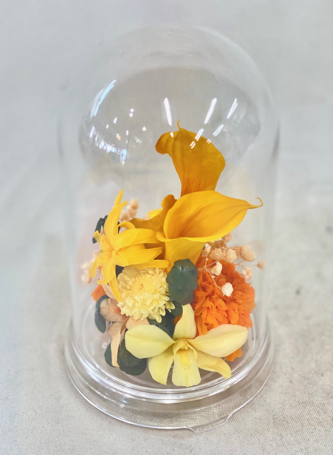 黄色のカラーやオレンジのカーネーションなどをプリザーブドフラワーに保存加工。