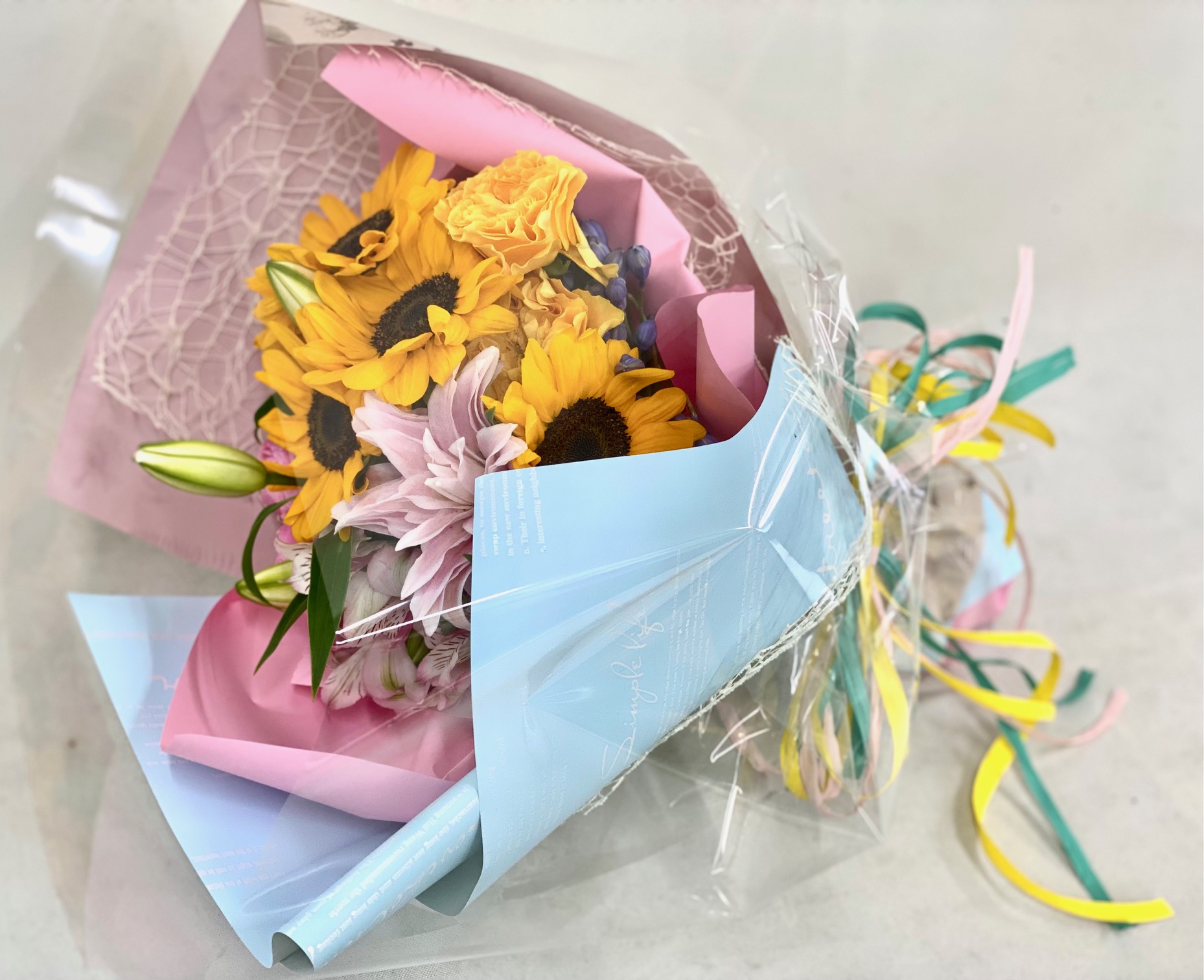 ひまわりとユリ、バラ、アルストロメリアなどを入れて。